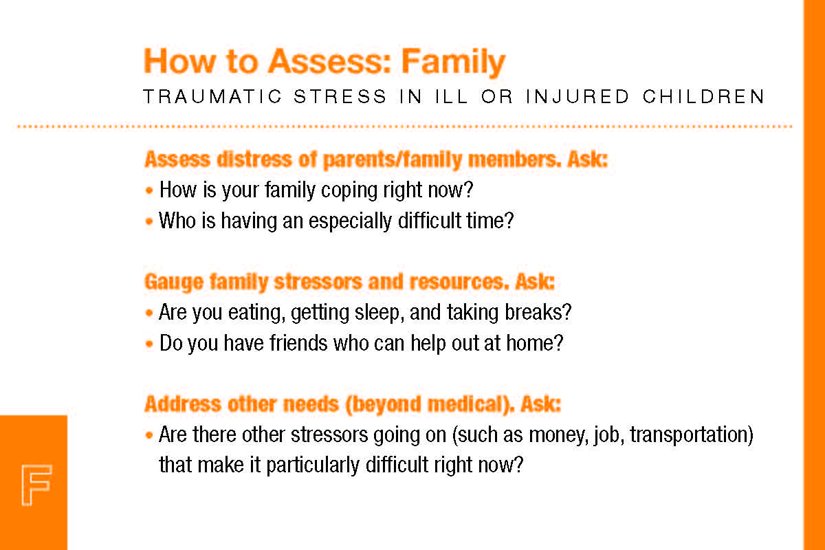Addressing Family needs includes assessing family stressors and resources, and recognizing that a child’s injury or illness impacts the entire family - parents, siblings, and other family members may also be distressed and may have traumatic stress reactions.